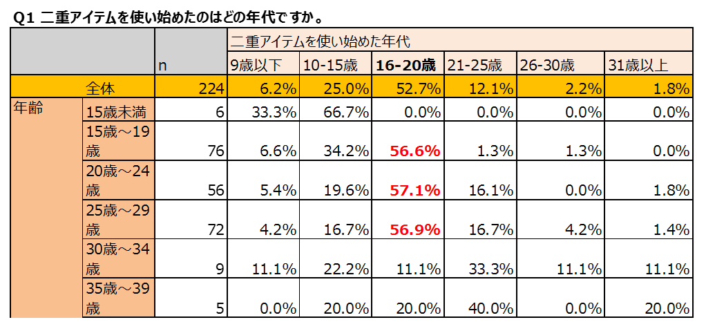 アンケートに最も多く答えてくれたのは、20-24歳の女性でした。その年代の人たちがアイプチを始めたのは「16-20歳」57.1%。